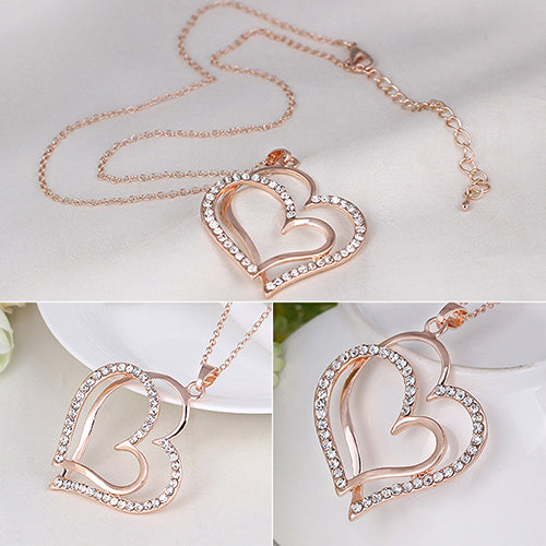 This beautiful chain necklace is decorated by double love heart with rhinestone, deep and beautiful rose gold color completes classic urban styling. Really a charming addition to any ensemble.